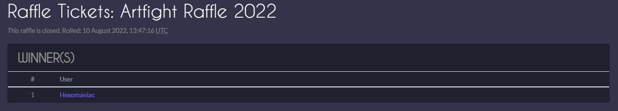 First off I would love to thank everyone for their involvement in the Artfight event! It got quite hectic near the close date, so we apologize for the lateness of approvals. Congrats to the following user for winning the AF 2022 design raffle. Your design will be uploaded shortly.